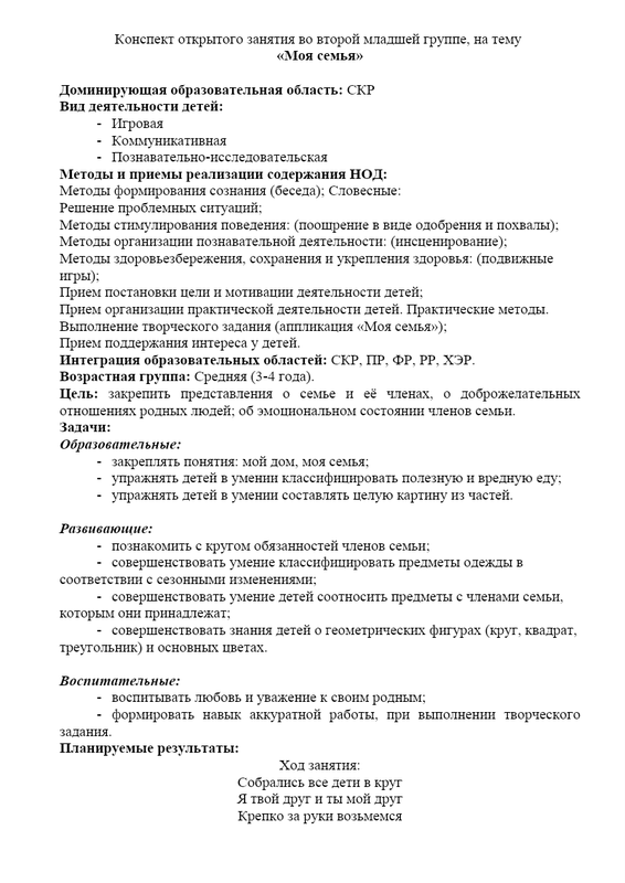 Конспект открытых занятий во второй младшей группе на тему «Моя семья»