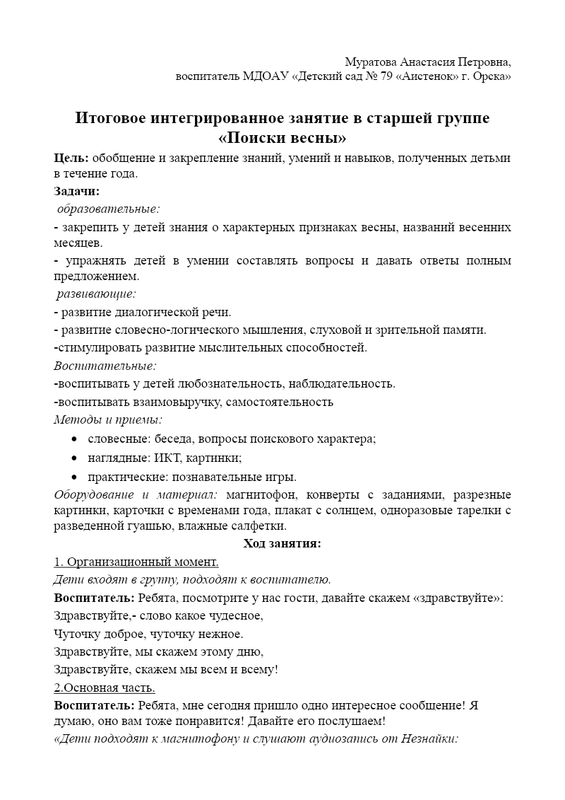 Итоговое Интегрированное Занятие В Старшей Группе Поиски Весны